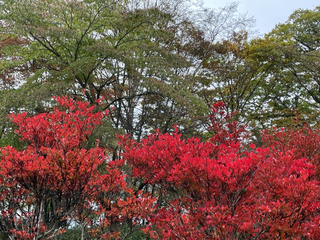 林のモミジや桜などの葉が赤や黄色に染まっています。