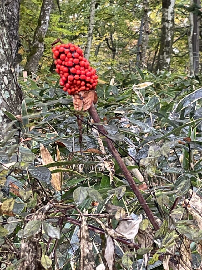 林の中に真っ赤なマムシグサの実も見られました。
