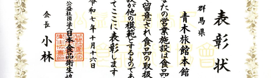 本日 「日本食品衛生協会会長賞」受賞! 青木旅館 本日 東京の明治座において、日本食品衛生協会の「表彰の会」が開催されました。 その会に青木旅館は社長と女将が参列し、会長賞を受賞してまいりました。 この度の受賞は、日々の業務において、スタッフ全員が食品の安全と衛生に留意 … カテゴリー:ブログ ブログ&ニュース 投稿日:2025.10.16