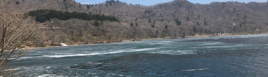 4月24日、朝はまだ全面凍っていた大沼、穏やかな良いお天気に恵まれ今日1日で大洞側から湖中央まで約半分氷が溶けました。まもなく全て氷が消えそうです❗