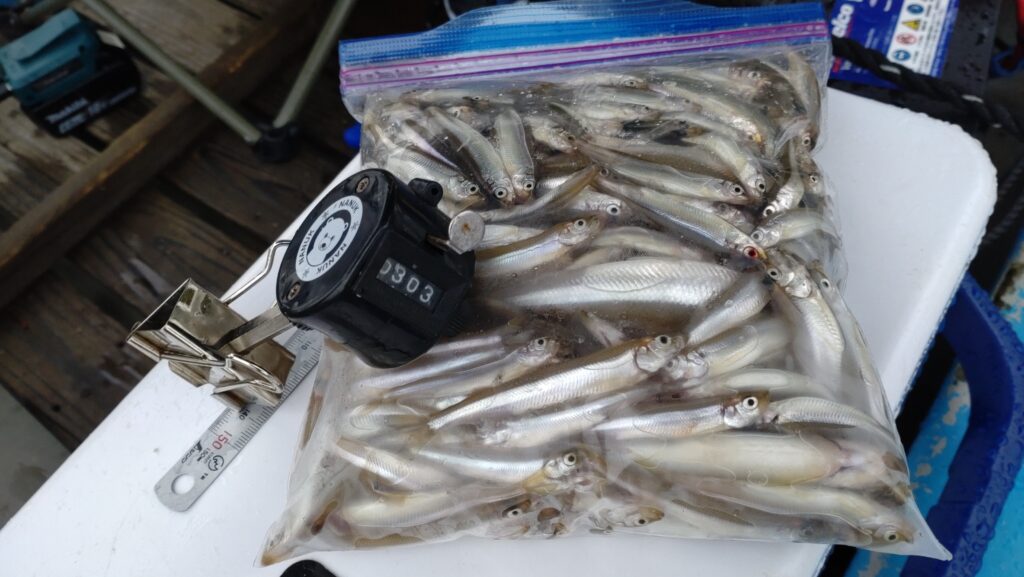 ★早朝は曇りでしたが、9時過ぎから雨と南風で厳しいコンディション、途中濃霧、スタートは魚影も良くデカサギも釣れましたが、途中から渋い感じ、エサ交換をまめに行うと釣れました。ご利用頂いた皆様ありがとうございました。皆様のご来店をお待ちしております。斉藤様兄弟お二人で島裏315匹、デカサギが釣れたそうです。(青木旅館、青木別館)