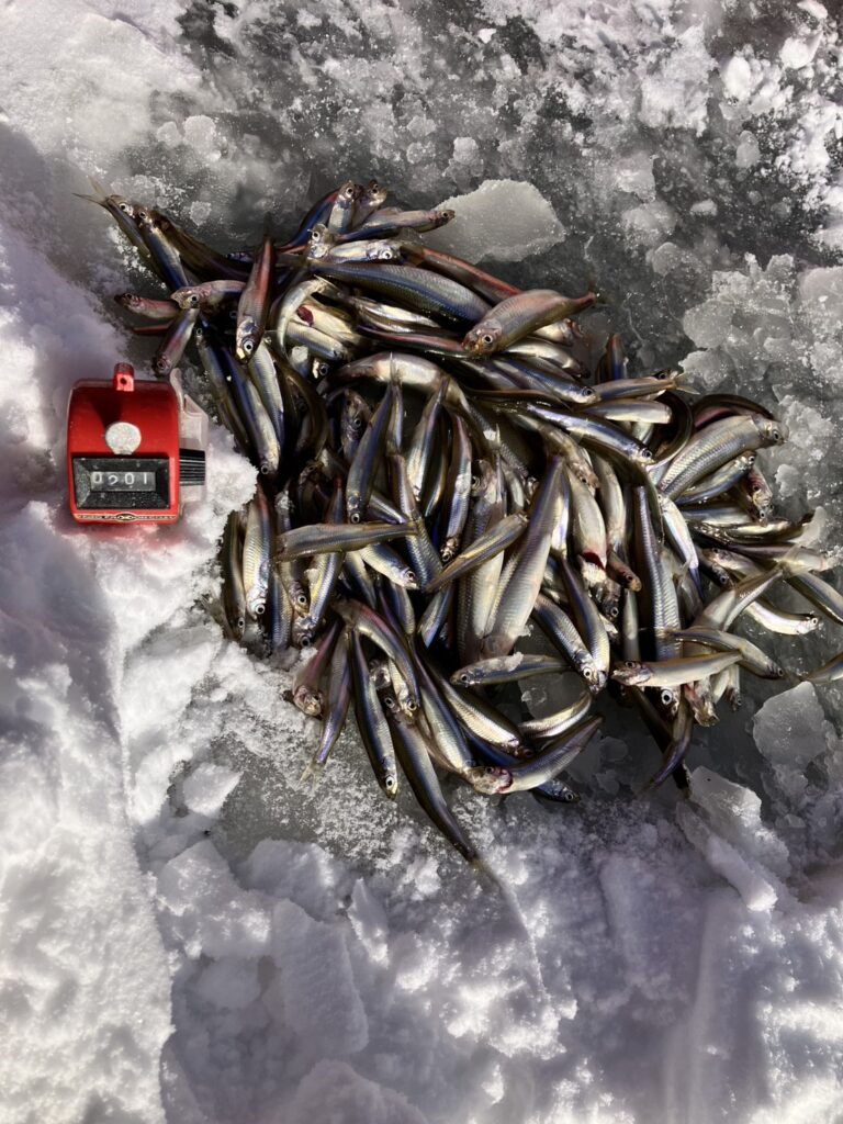 ☆1月21日(水)釣果、ドカン前(水深6m)小林様220匹、フカンド(水深15.3m)松本様205、福島様201匹、植野様130匹、リンク脇(水深11.4m)栗原様105、天気(晴れ)気温(ー12℃〜ー5℃)氷厚(24㌢〜27㌢)サイズ(5㌢〜13㌢)