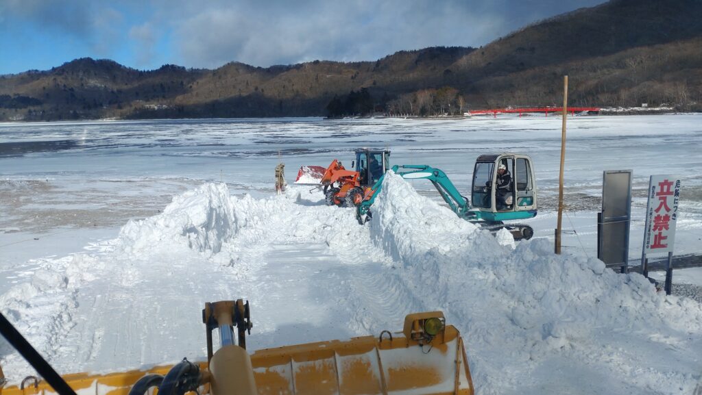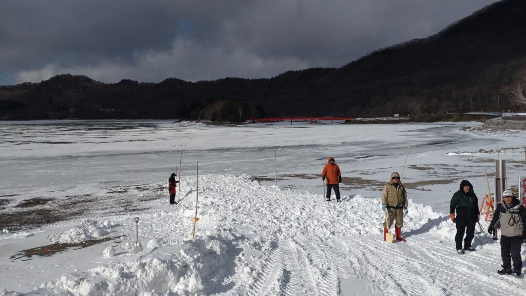 1/7(水)島裏入場口雪入れ作業、1/8(木)水門前、旅館前入場口雪入れ作業、1/9(金)1回目氷厚検査予定です!