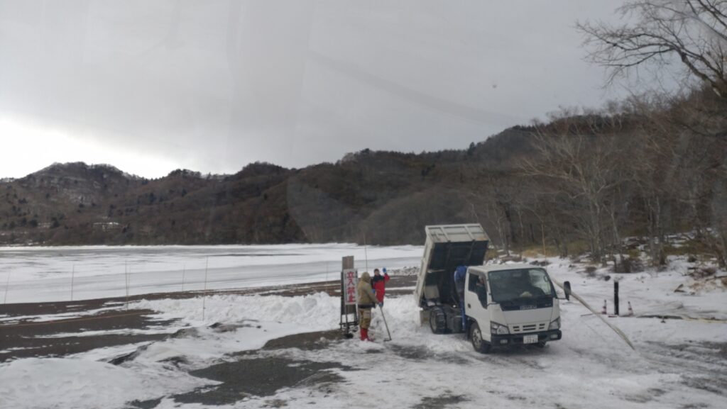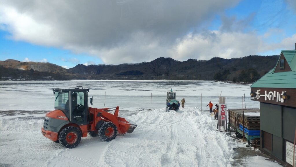 ☆1月6日(火)より氷上ワカサギ釣り解禁に備えて、入場口通路に雪入れ整地作業など始めました。過去最高に渇水状態で氷結が始まった大沼、各入場口共に駐車場から氷上までの通路が長く雪入れ作業も大変です。作業初日、風が強く寒い湖畔で組合員サポートの皆様お疲れさまでした。
