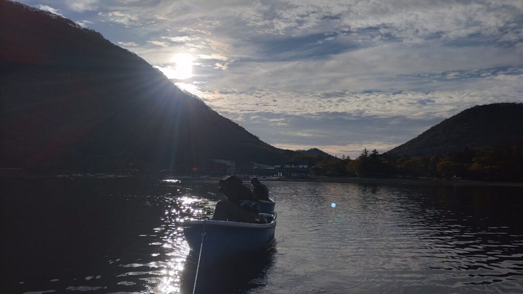 ★穏やかな朝、午前中は晴れて湖上ボートから見る湖畔紅葉景色が綺麗でした。魚影はあっても渋い感じ、エサ交換とゆっくり誘い続け釣果を伸ばしましょう。ご利用頂いた皆様ありがとうございました🙇皆様のご来店をお待ちしております。(青木旅館、青木別館)