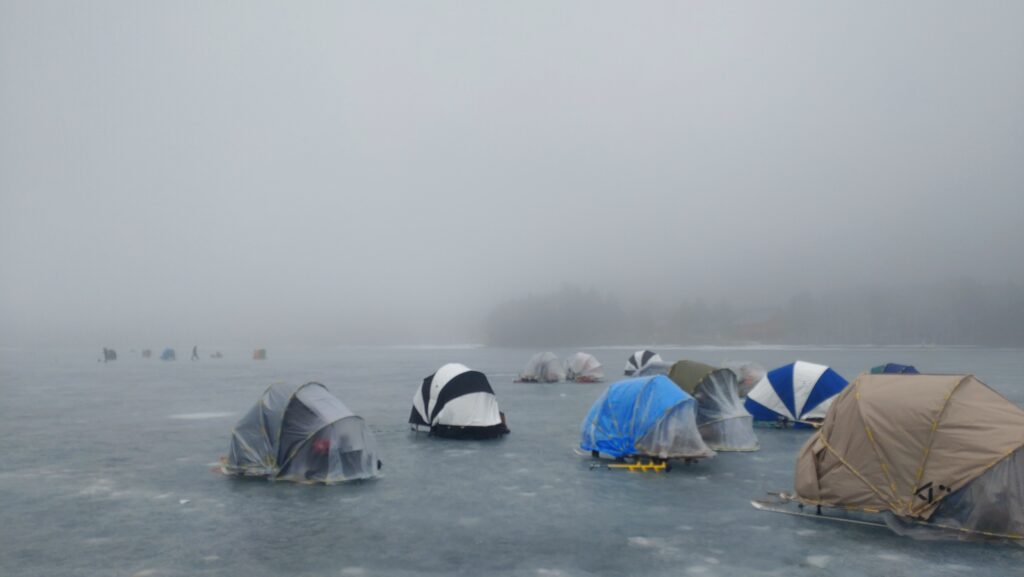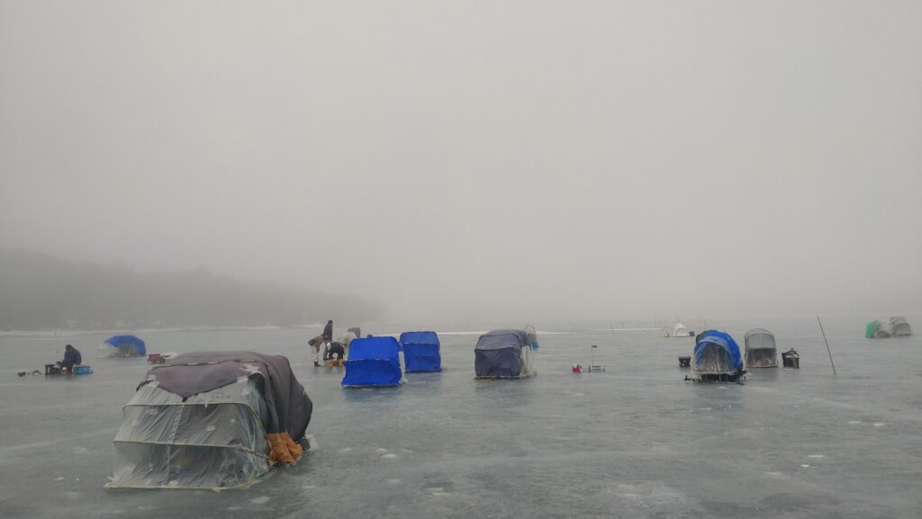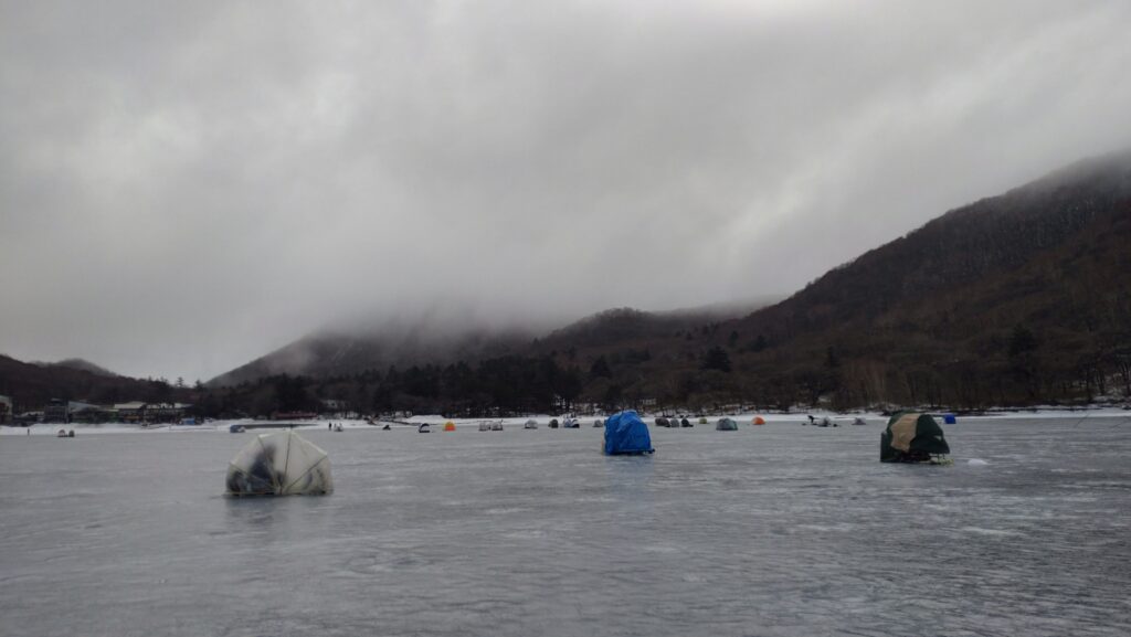 ★穏やかな湖畔、午前中は曇り空、午後は霧の湖上で肌寒く感じました。魚影はありますが全体的に渋い感じでした。皆さん氷上終盤をカタツムリテント内で楽しんでいました。ご利用頂いた皆様ありがとうございました🙇(青木旅館、青木別館)