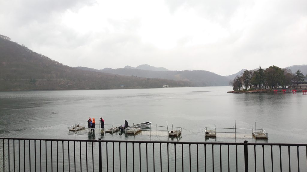 4月18日(火)ワカサギ卵の入った沼尻&大洞エリアの浮桟橋を沖に設置、無事に作業が終了しました。午前中はみぞれ❄️午後は冷たい雨が降る湖畔、とにかく寒い湖上で1日フルの仕事でした。組合員の皆様お疲れさまでした。(青木旅館、青木別館)